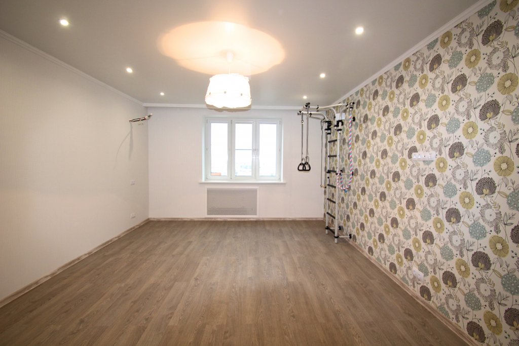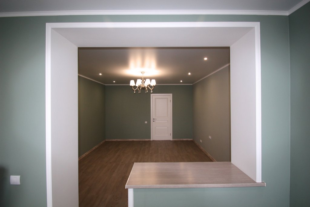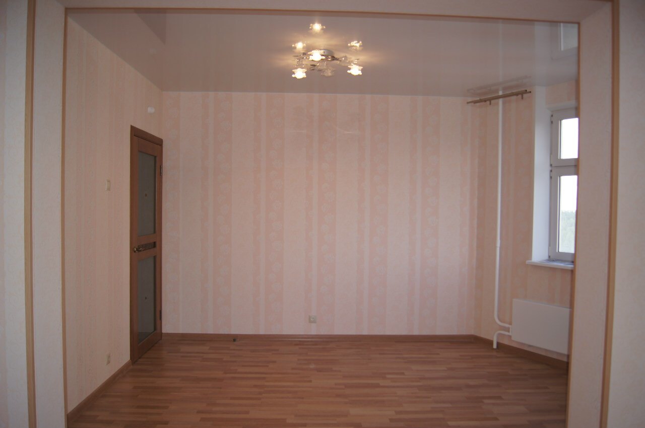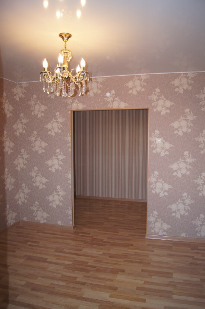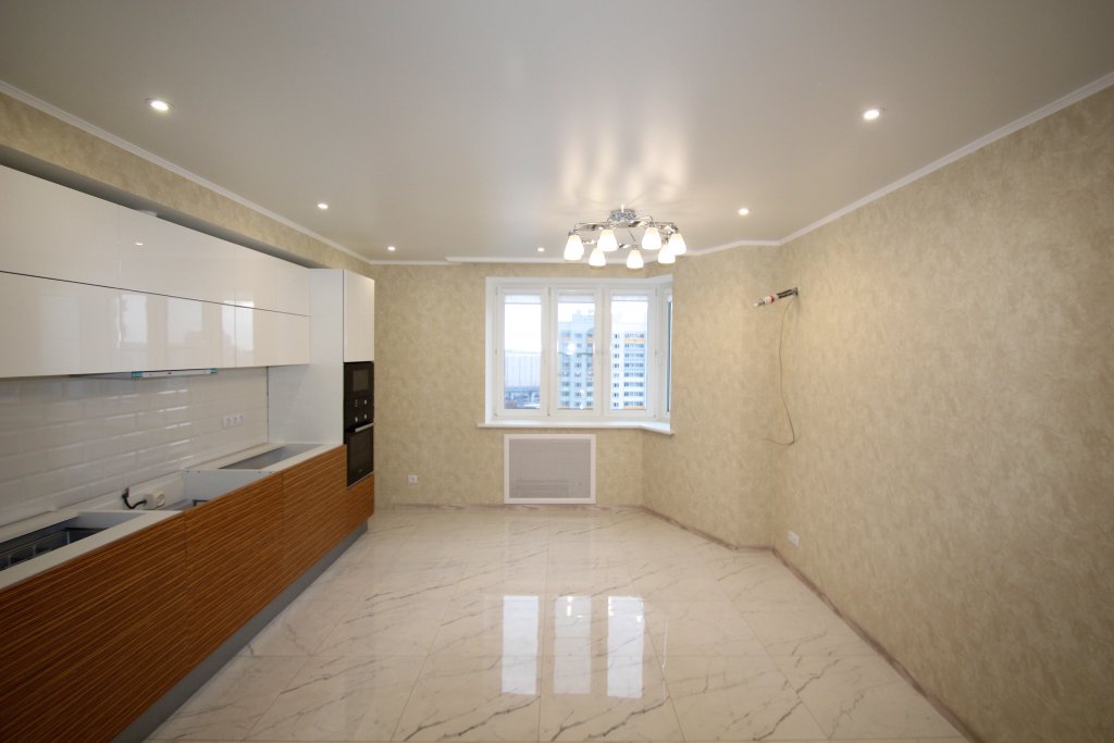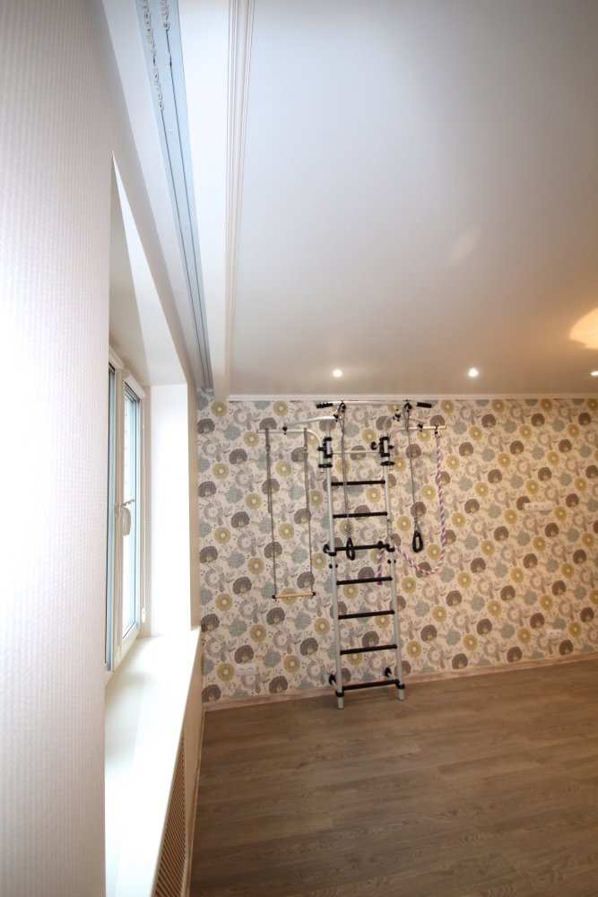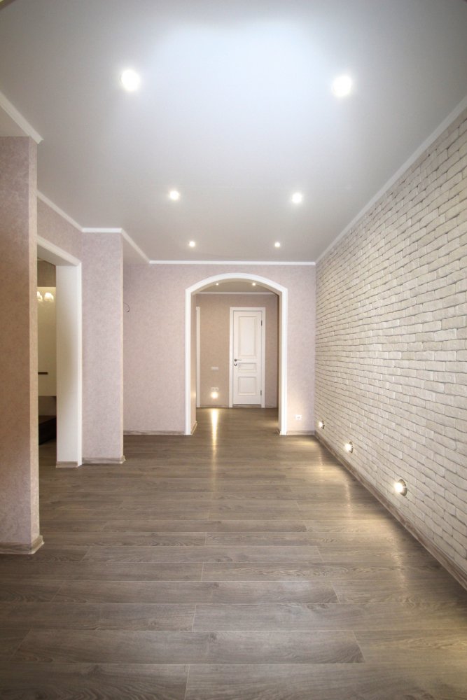 выполнен ремонт «под ключ»: стяжка, штукатурка, шпаклевка, натяжные потолки с элементами